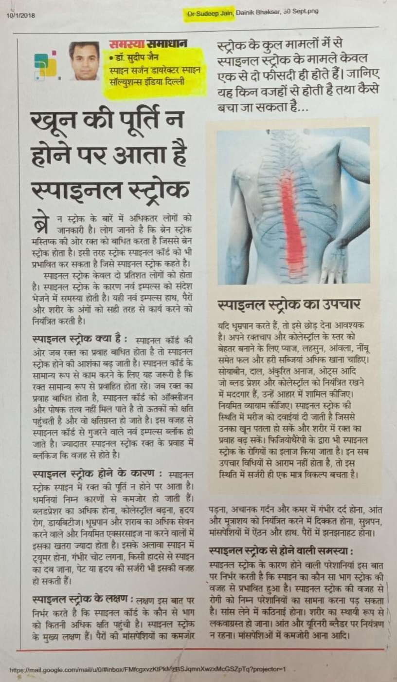 खून की पूर्ति न होने पर आता है स्पाइनल स्ट्रोक (Dated 01 Oct 2018)
