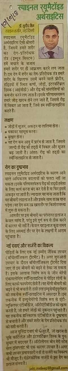 स्पाइनल रयूमेटाइड आर्थराइटिस आधुनिक इलाज से नई आशा (Dated: 18-Nov-2014)